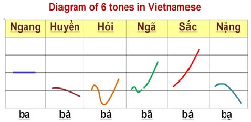 At first, as you can see Vietnamese is a tonal language, and tone is an indispensable part in the syllable structure. As you know, There are 6 tones in the Vietnamese language and they are named differently. They are: ngang, huyền, sắc, nặng, hỏi, ngã. Let’s have a look at the diagram below: